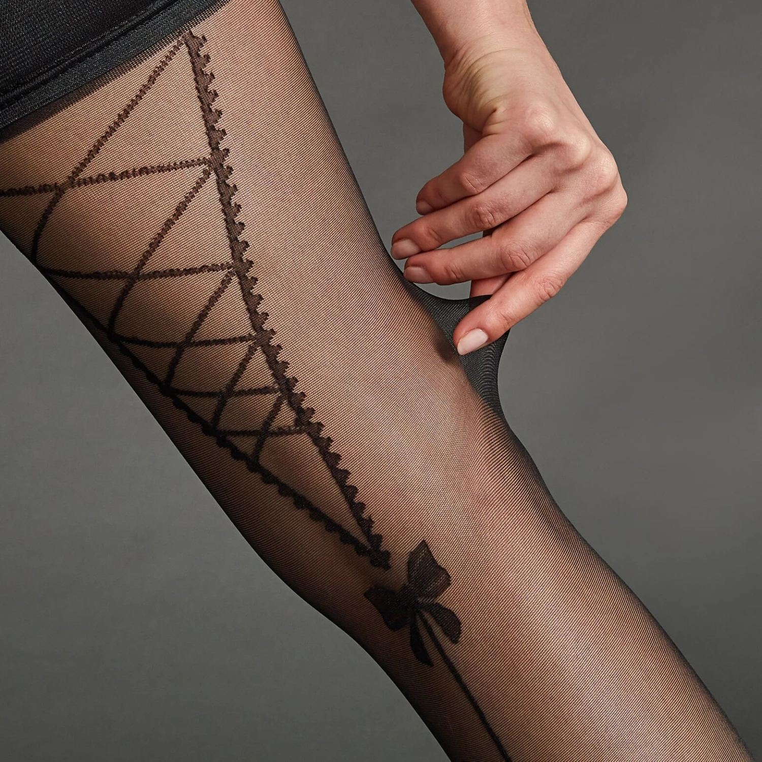 « Un dessin noir stylisé évoque les bas lacés, les petits noeuds fantaisie et les coutures marquées sur le mollet. »