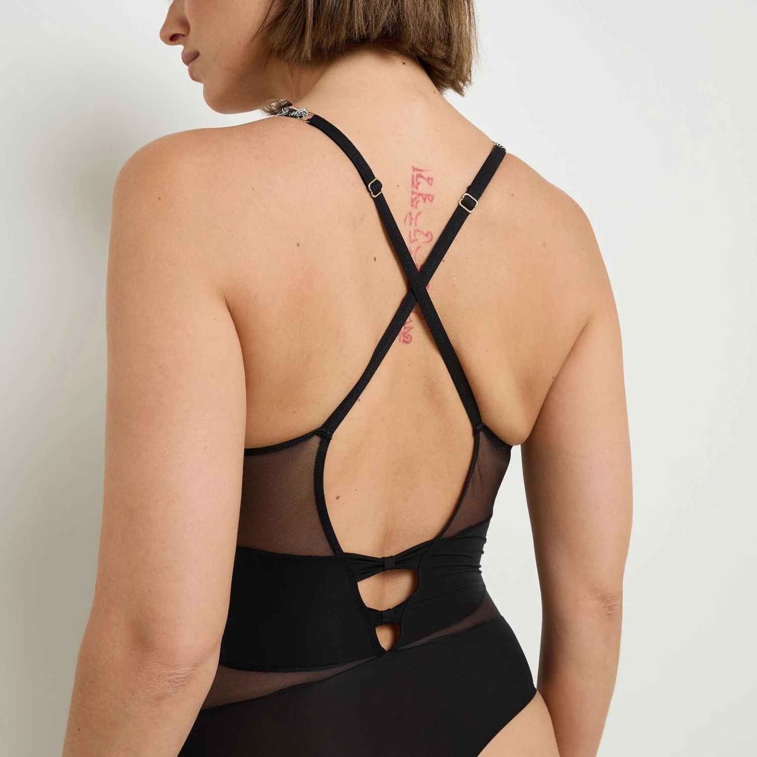 Le body HARPER se distingue par son contraste de matières raffinées : une dentelle bicolore ajourée sur le buste associée à une microfibre lisse et des empiècements en tulle transparent. Son dos très échancré est magnifié par des nœuds fantaisie en microfibre mate, apportant une finition couture sophistiquée.