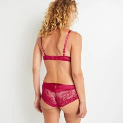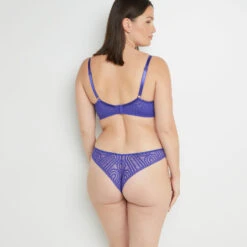 « La parure HAPPY affiche des couleurs acidulées agencées en motifs géométriques et rehaussées de fils subtilement scintillants. Son jeu de transparence vraiment séduisant et ses lignes hyper actuelles dessinent une lingerie joyeusement désirable. »