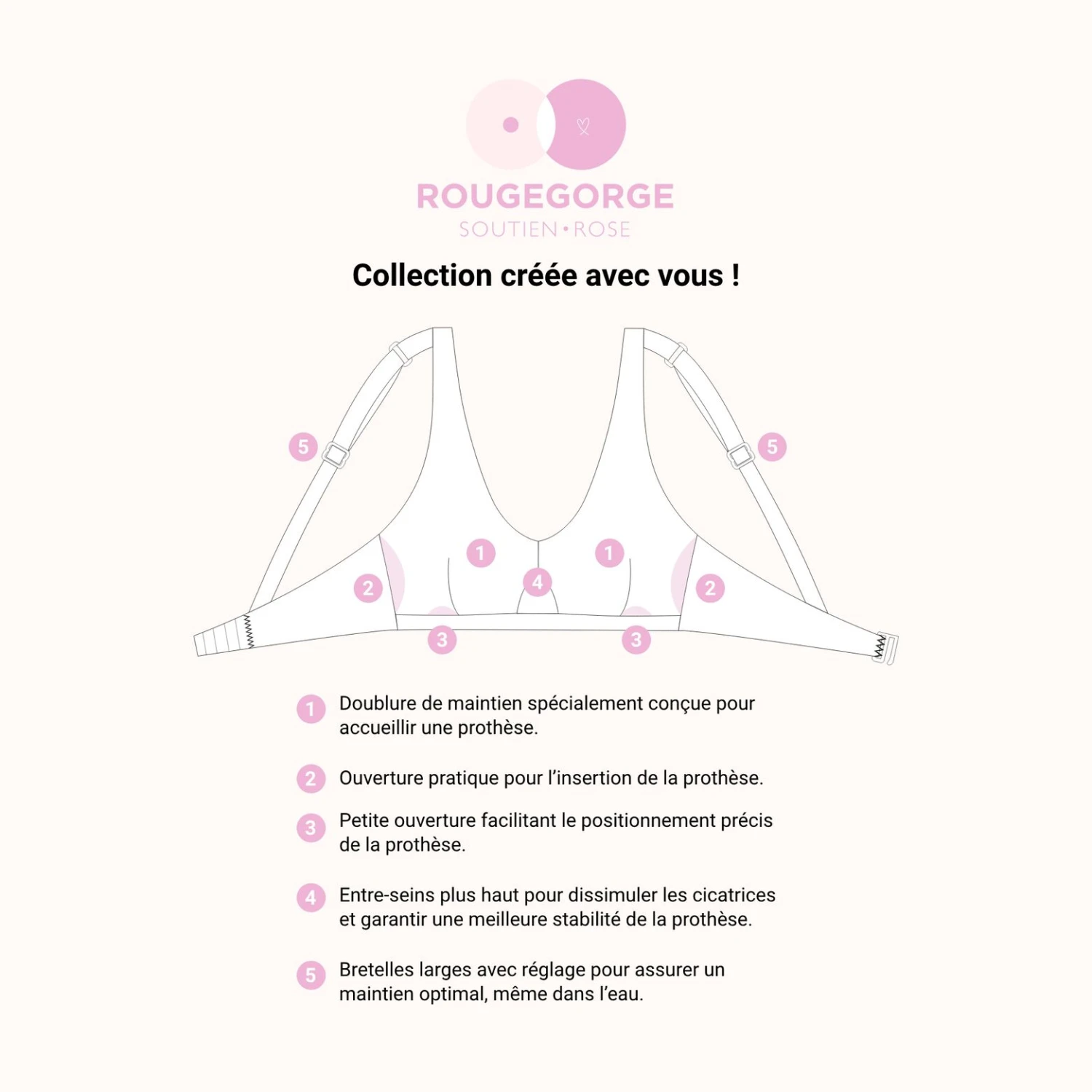 « Les équipes RougeGorge soutiennent la lutte contre le cancer du sein. Cet engagement nous a permis de co-créer avec nos clientes concernées, des maillots de bain post-opératoires spécialement étudiés pour les femmes ayant eu une mastectomie totale ou partielle. Doux et couvrants, ils masquent les cicatrices et sont comme une caresse sur la peau. Sans armatures, élastiqués sous la basque, ils offrent un confort absolu. A l’intérieur, la doublure moelleuse en polyamide très douce est sans pince pour éviter les frottements désagréables. Elle permet aussi de placer discrètement des prothèses mammaires. »