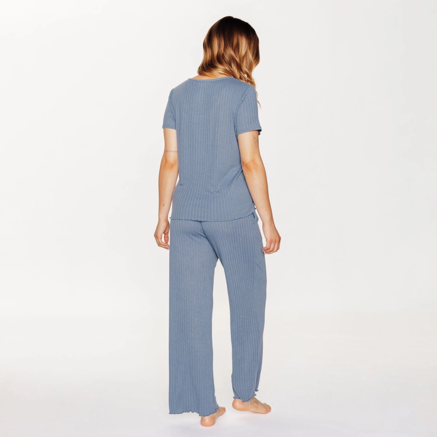 Ce pantalon de pyjama se distingue par son coloris bleu apaisant et ses lignes verticales dlicatement textures. Sa finition « bourdon » au bas des jambes cre de lgres ondulations lgantes, ajoutant une touche de raffinement votre tenue de nuit. La coupe courte mi-cheville offre une silhouette moderne et lgre.