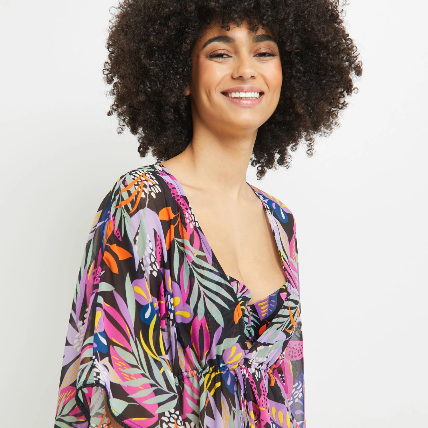« Un motif coloré, foisonnant de motifs végétaux joyeusement stylisés, s’épanouit sur la ligne de bain LAVANDE. Vous y trouverez toutes les formes de maillots : plus ou moins échancrés ou couvrants, pour toutes les morphologies, et même de jolis paréo et tunique assortis. »